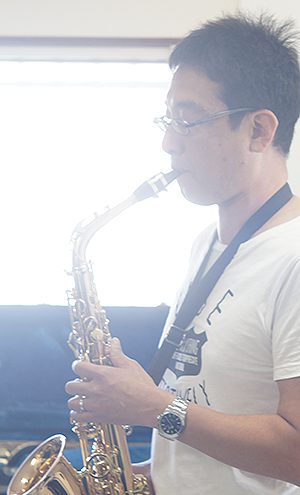 これは江頭さんに吹いて頂いて「なるほど」と思った事ですが、今のサックスと違って音の指向性が無いんです。つまりどっちの方向を向いて吹いていても、聞こえ方が同じなんです。現代のサックスは、音がしっかりベルから前に飛ぶように出来ているので、ベルの前に立って音を聞いた時と、楽器の側面に立って音を聞いた時とでは音の聞こえ方がはっきりと違います。